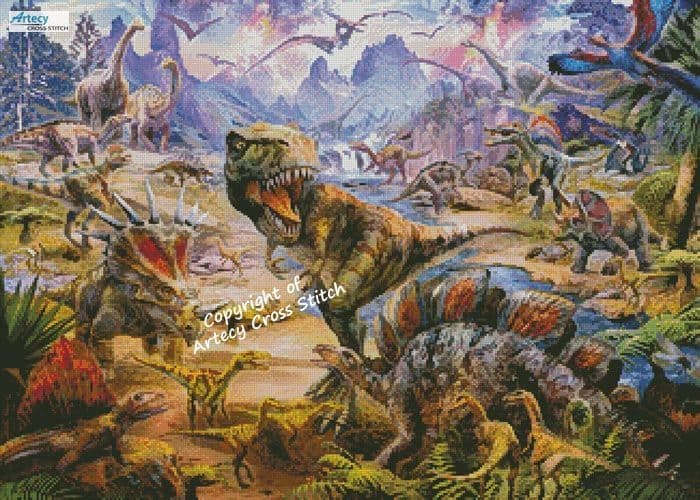 This counted cross stitch pattern of Dinosaurs was created beautiful Artwork by Jan Patrik Krasny. Original image licensed through Meiklejohn Graphics Licensing (MGL). Only full cross stitches are used in this pattern. It is a black and white symbol pattern.