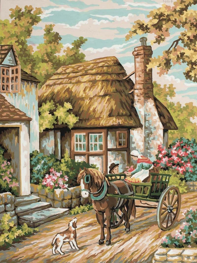 CANVAS ONLY. This tapestry canvas from Grafitec features a horse and cart selling bread at a thatched cottage. 10 count duo canvas with screen printed design. List of DMC thread requirements included, with cotton and wool options. Canvas size 40cm x 50cm.