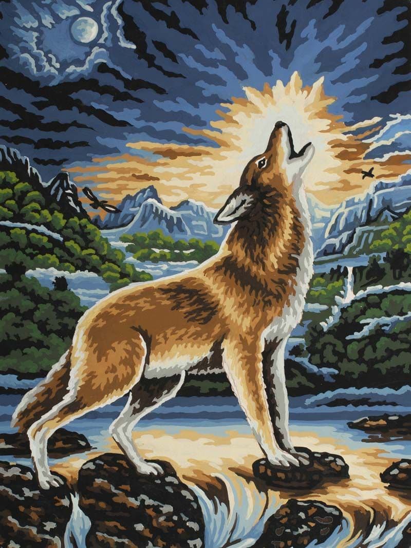 CANVAS ONLY. This tapestry canvas from Grafitec features a wolf howling to the moon. 10 count duo canvas with screen printed design. List of DMC thread requirements included, with cotton and wool options. Canvas size 40cm x 50cm.