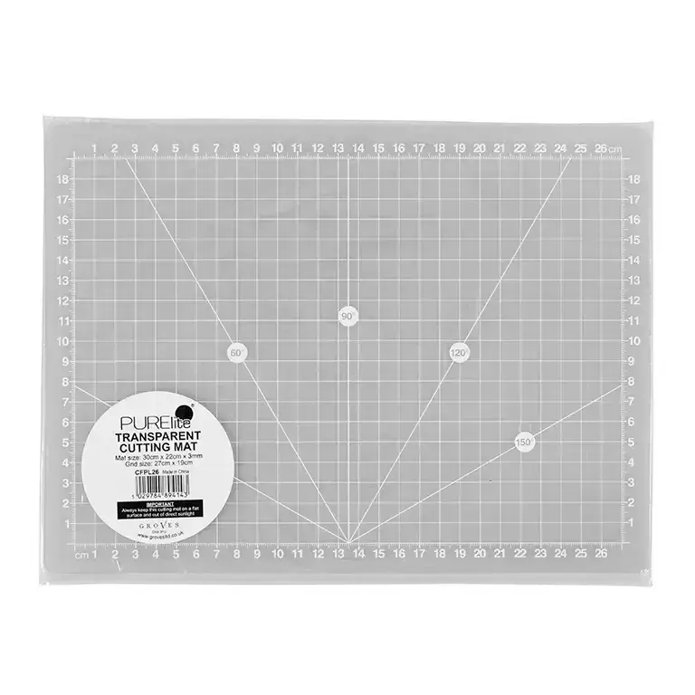 | These self-healing cutting mats are designed to be used in conjunction with a light box. Their translucent nature allows the light to shine through when tracing or cutting a design into fabric. Clear cm grid markings with 30°, 60°, 90°, 120°, 150° angle lines. 3mm thick for durability. Dimensions of mat: (d/w/h) 3mm x 30cm x 22cm. |