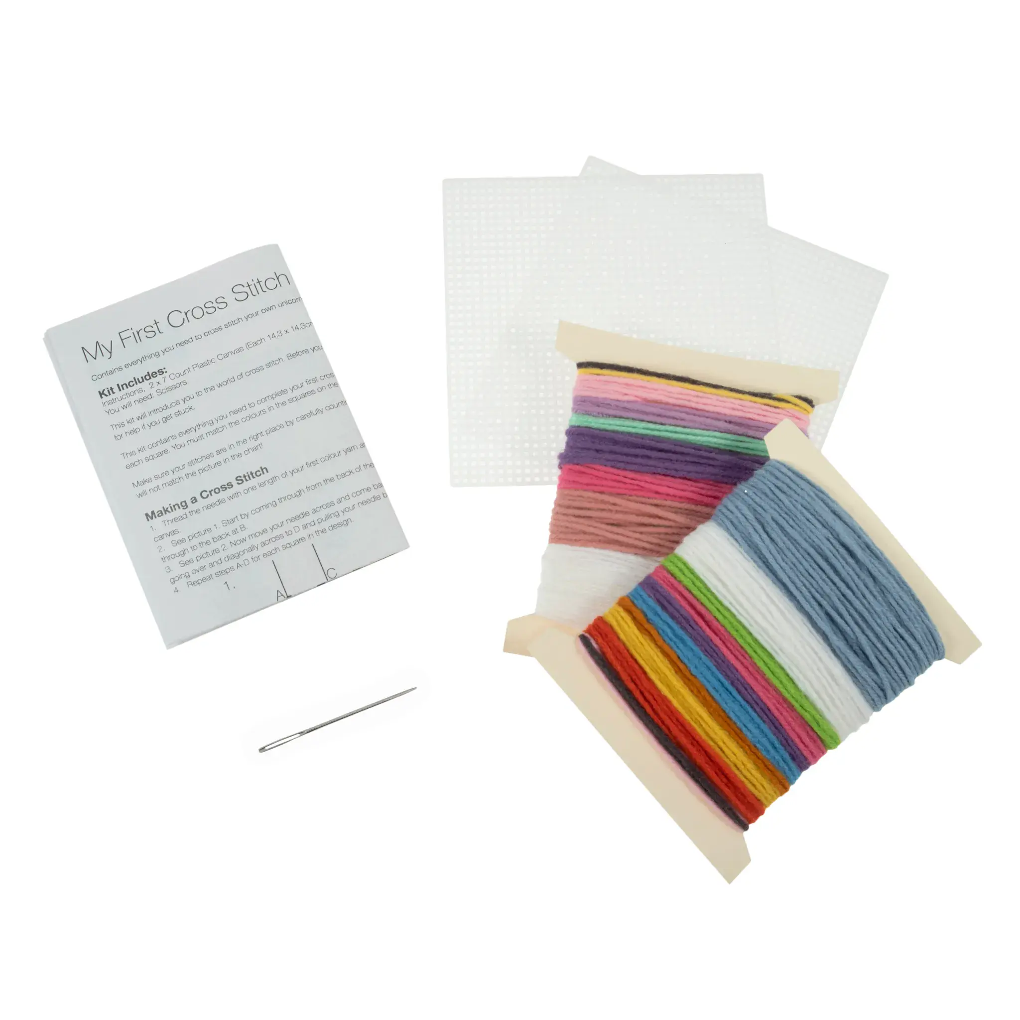 This kit contains everything you need to start cross stitching. Kit includes: 2 sheets of 7 count, plastic canvas measuring (w/h) 14.3 x 14.3cm; 2 x metal needles; acrylic yarns and instructions. Approximate finished size: (w/h) 14.3 x 14.3cm. Gentle hand wash after stitching.